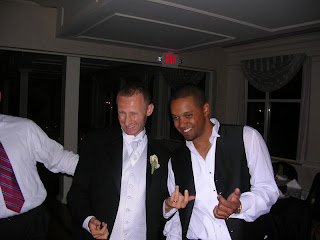We had the best time at Frank & Regina's wedding yesterday. It was our first Long Island wedding, and I hope it's not the last--they sure know how to have a good time out east! The ceremony was in a beautiful, spacious church in downtown Huntington. Regina glowed in a beaded halter gown with a full skirt and cathedral-length train, looking absolutely regal with an Audrey Hepburn-inspired updo. The bridesmaids added a splash of color to the gloomy afternoon with their hot pink satin dresses; the color was matched the flowers (gerber daisies and roses) and the groomsmens' ties. Later on, we made our way to the Woodbury Country Club where guests indulged in an extravagant cocktail hour buffet (I skipped the various stations to save up for dinner). We moved into the elegantly-appointed ballroom for a five-hour(!) reception complete with a Frank Sinatra-esque crooner (if you closed your eyes while he was singing, you'd think you were hearing the real deal) and a hyper emcee who kept the tunes spinning until 1:00 a.m.! I made sure to take a few breaks from the dance floor to eat (crabcake appetizer followed by the entree: I chose salmon with dill sauce, Mark got the steak, but there was also a choice of chicken marsala, or vegetarian) and sample the delectable dessert bar (various pies, tiramisu, cakes, and cookies, plus a bevy of sweet drinks to sample--I tried Irish Coffee). And then there was the wedding cake, which looked delicious (I missed my chance to taste it because I was too busy diving in to the other desserts!).